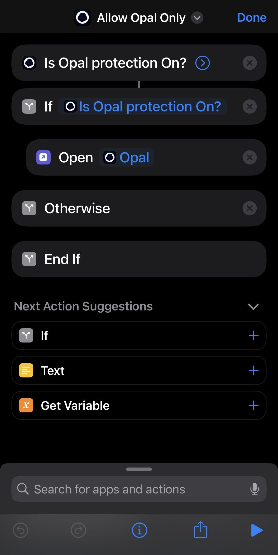 - Set a automation that runs this shortcut when the Opal app is closed AND opened